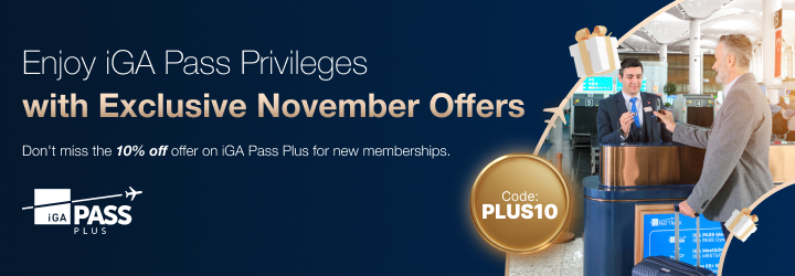 iGA Pass Plus enables you to benefit from Fast Track, Fast Check-in, iGA Lounge, iGA Lounge Domestic, iGA Pop-Up Lounge and Buggy services together with one additional guest so that you can experience the comfort of traveling above the clouds with all the privileges offered to you by iGA Pass.